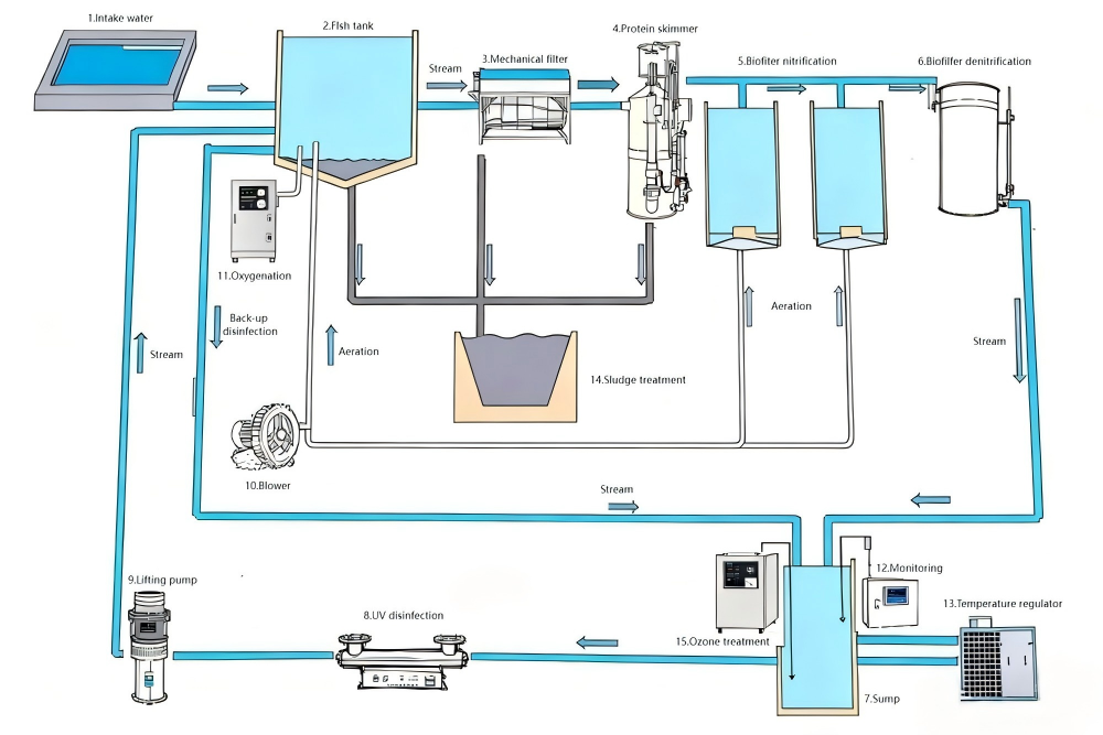 Oxygenation and Temperature Control: Pure oxygen injection meets the high oxygen demand of dense stocks, and a thermoregulation system liberates production from seasonal constraints.